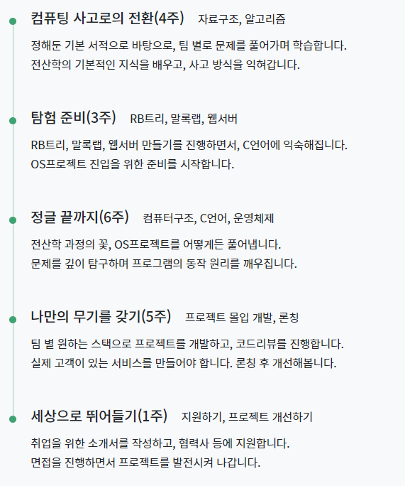 sw 사관학교 정글의 커리큘럼은 단순히 취업을 위한 내용으로 국한되어 있지 않다. 오히려 전산학에 맞춰진 느낌이 들기도 한다. 하지만 이과정에서 본인이 충분히 프로그래밍 스킬을 향상시킬 수 있다고 생각한다.